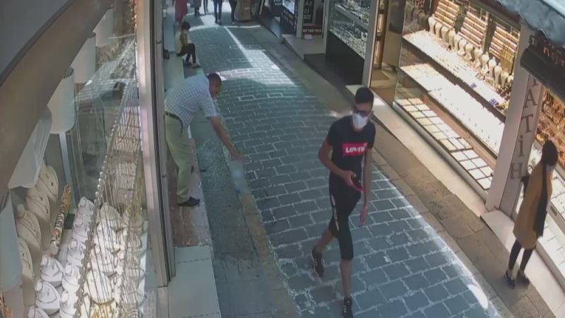 Şahsın yüzük tablasının hepsini çalmak istediğini belirten görgü şahidi Süleyman Şenocak, “Şahıs, bir tane yüzük alıp verdi. Bir daha aldı verdi. Daha sonra telefonunu cebine koydu. Aslında o ara yüzük tablasını hepsini almak istedi ama yapamayınca iki tanesini takıp kaçtı. Arkasından bağırdık, koştuk” dedi.