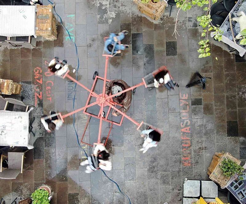 Kayseri’de 1980 ve 1990’lı yıllarda kullanılan eşyaların konsept olarak kullanıldığı çayevine getirilen seyyar salıncak ile çocuklar keyifli vakit geçiriyor.