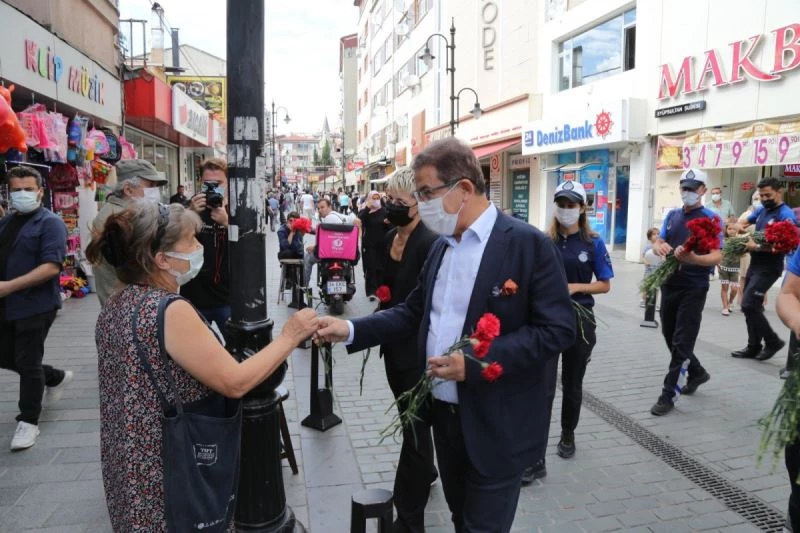 Başkan Deniz Köken, vatandaş ve esnafa karanfil dağıtımının ardından Eyüpsultan Belediyesi Zabıta Müdürü Oya Banu Göl Yıldırım’a da karanfil vererek tüm zabıtaların haftasını kutladı.