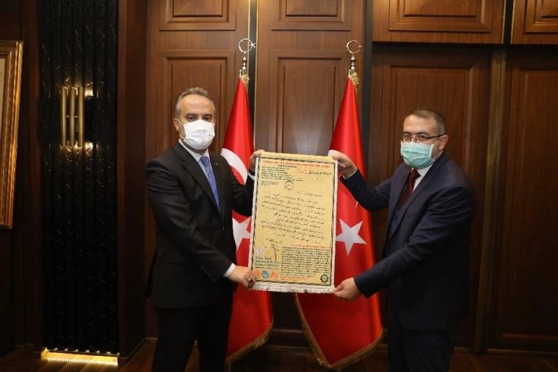 Dumlupınar Üniversitesi Mezunları Derneği Başkanı Mutlu Çınar, Büyükşehir Belediye Başkanı Alinur Aktaş’ı ziyaret edip, zaferin 99’uncu yılında yapılacak faaliyetleri anlattı. Bursa Büyükşehir Belediyesi’nin katkılarıyla 2019 yılında başlattıkları projenin, bir Türkiye projesine dönüştüğünü belirten Çınar, “AK Parti Yerel Yönetimler Başkan Yardımcısı Bilecik Milletvekili Sayın Selim Yağcı’nın öncülüğünde İçişleri Bakanımız Süleyman Soylu’nun da destekleriyle yürütülen milli mücadelenin yüzüncü yılında ‘Farkına Var Vefa Göster’ projesi artık bir Türkiye projesidir. Zaferin 99’uncu yılı olan bu yıl Ankara’dan zafer treni kalkacak. Eskişehir, Kütahya ve Afyonkarahisar merkezine uğrayacak tren daha sonra Dumlupınar İstasyonu’na gelecek. Dumlupınar’da yine sabah namazı kılınacak ve askerlerin o günkü kumanyası davetlilere ikram edilecek. Bu törenlere protokolü davet için özel bir davetiye hazırladık. Mustafa Kemal Paşa’nın el yazısından “Ordular ilk hedefiniz Akdeniz’dir ileri” emrinin orijinal halıya baskısını davetiye dönüştürdük. İlk davetiyeyi başkanımıza veriyoruz. Etkinliklere verdikleri destekler nedeniyle Başkanımıza çok teşekkür ediyorum” dedi.