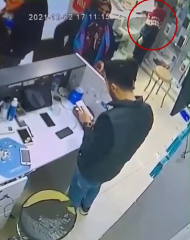 Cep telefonu hırsızlığı iş yerinde bulunan güvenlik kameraları tarafından saniye saniye kaydedildi. Görüntülerde, şüpheli çocuğun mağazadaki ürünlere bir süre baktıktan cep telefonunu çaldığı görülüyor. Çocuk daha sonra mağazadan hızla çıkıyor.