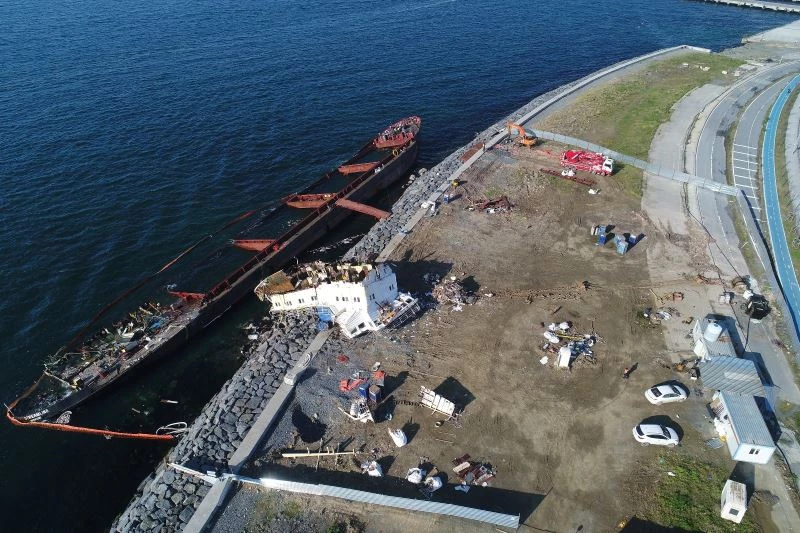 Zeytinburnu’nda fırtına nedeniyle kıyıya vuran geminin parçalanma işlemleri devam ediyor. Geminin yaşam alanı kesilerek gövdesinden ayrılırken, parçalanma işlemi ve işçilerin çalışması havadan görüntülendi.