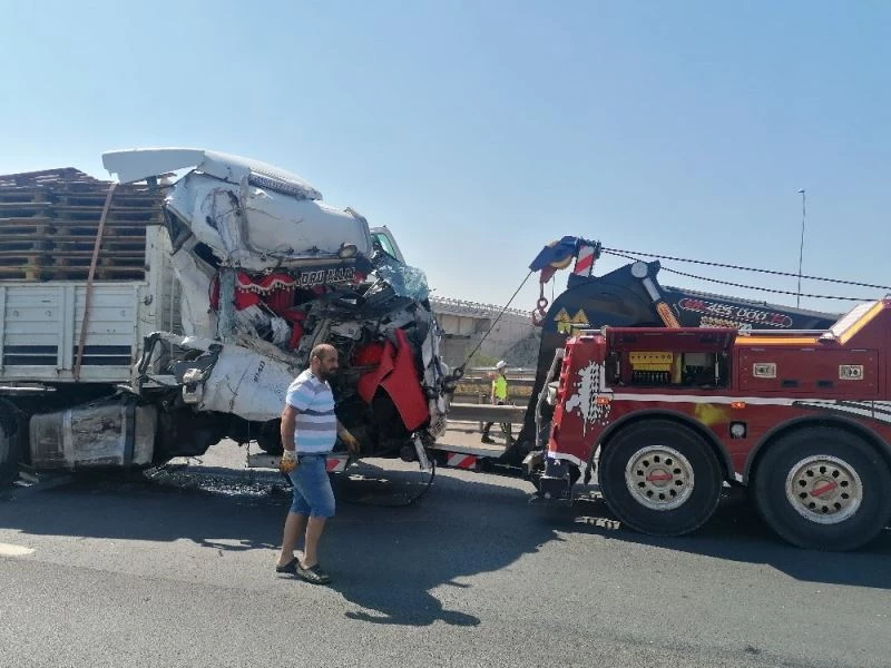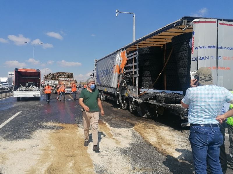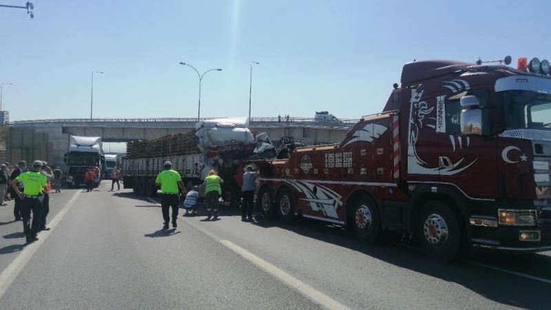 Kocaeli TEM Otoyolu Osmangazi Köprüsü ayrımında 3 aracın karıştığı zincirleme trafik kazında hurdaya dönen tırın sürücüsü kazayı yara almadan atlattı. Kaza nedeniyle kapanan yolda ise uzun araç kuyrukları oluştu.