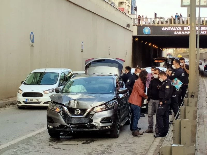 Antalya’da alt geçitte 4 araçlı zincirleme trafik kazasında sivil bir polis aracı motor bölümünden alev alev yandı.