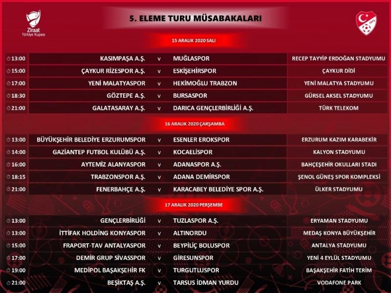 Türkiye Futbol Federasyonu’nun resmi internet sitesinden yapılan açıklamaya göre Ziraat Türkiye Kupası 5. Eleme Turu maçlarının programı şöyle: