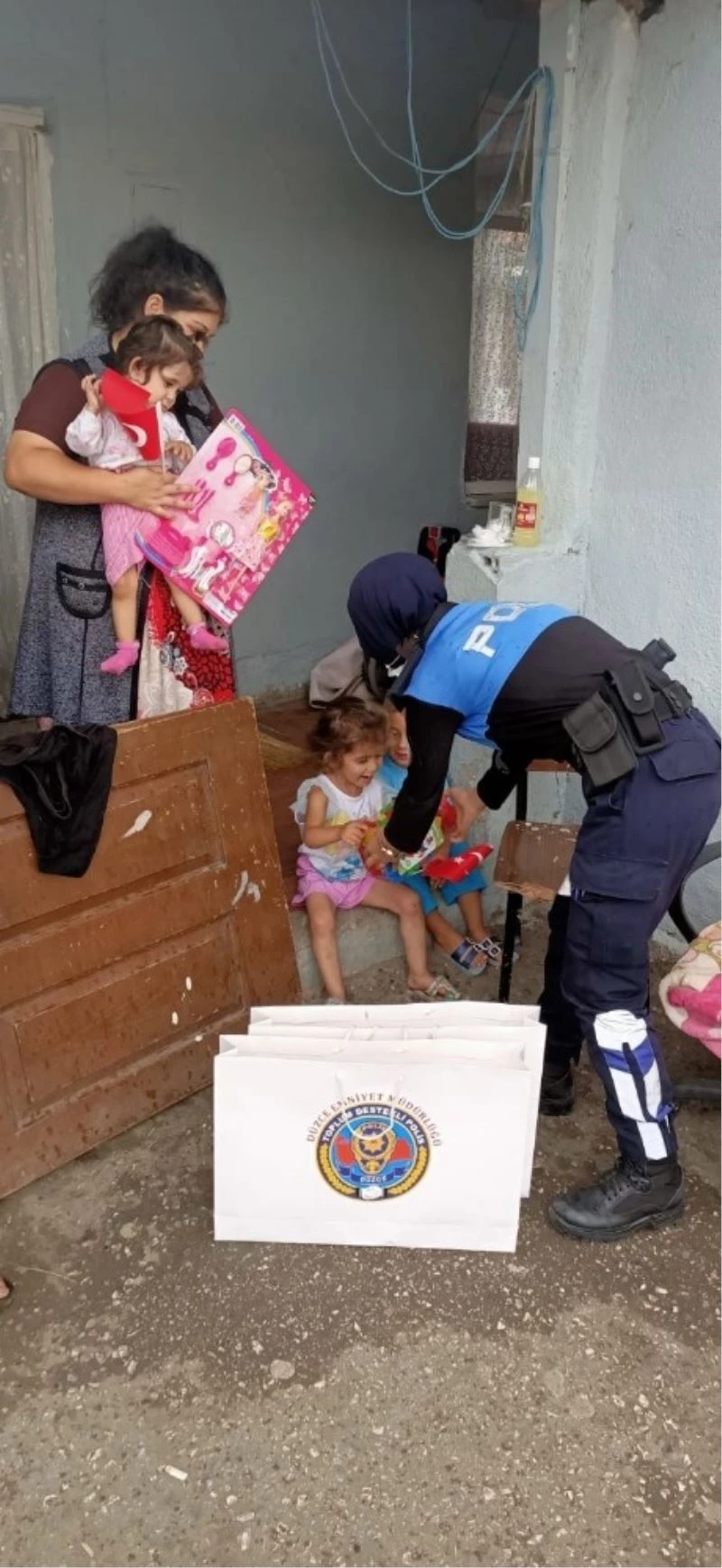 Düzce İl Emniyet Müdürü Mehmet Ali Akkaplan, Jandarma Alay Komutanı Mustafa Çetinkaya ve polis ekiplerinin katıldığı maske dağıtımı sırasında Ağa Mahallesi’nde karşılaştıkları 3 engelli çocuğu bulunan aileye kayıtsız kalamadı. Verdiği talimatla çocuklar için hazırlanan paketler polis ablaları tarafından çocuklara teslim edildi.