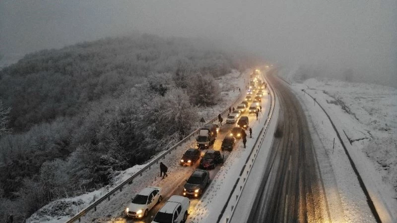 Zonguldak’ta aniden başlayan kar yağışı nedeniyle Zonguldak-Ereğli karayolunda kilometrelerce kuyruk oluştu. Ağır tonajlı araçların yolda mahsur kalması nedeniyle yol trafiğe kapandı.