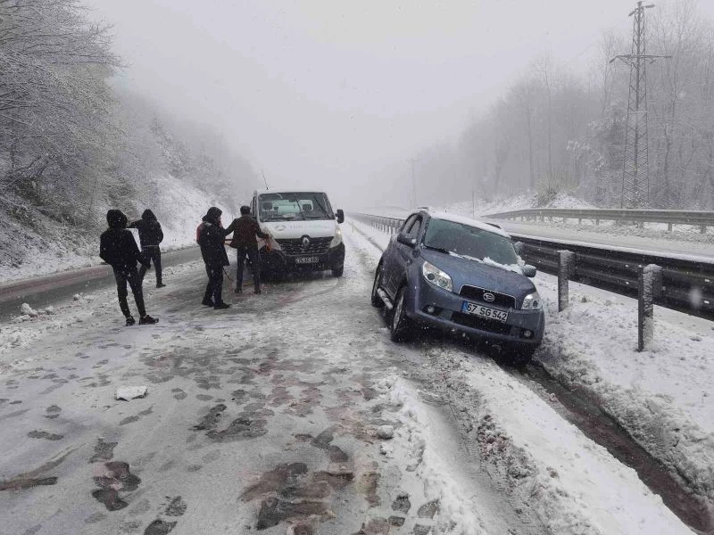 Zonguldak’ta aniden bastıran kar yağışı nedeniyle Zonguldak Ereğli karayolunda etkili oldu yoğun kar yağışında sürücüler zor anlar yaşadı. Meteoroloji Genel Müdürlüğü’nün yoğun kar yağışı uyarısı sonrası kentte aniden bastıran kar yağışı kısa sürede etkili etkisini gösterdi. Zonguldak-İstanbul karayolunda sürücüler yoğun kar yağışı nedeniyle dikkatli seyir etti. Uzun araçlar ve zincirsiz araçlar yollarda kaldı. Karayolları ekipleri yollarda kar küreme işlemi yaptı. Yoğun kar yağışı nedeniyle Ereğli yolunda tırlar yolda kalırken yolda yoğun kar yağışı nedeniyle maddi hasarlı kazalar meydana geldi.