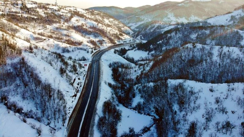 Zonguldak-Ankara karayolu kış mevsiminin gelmesiyle adeta beyaz gelinliğini giydi. Ormanlarla kaplı yol, sürücülere unutulmaz anlar yaşatıyor. Drone ile havadan görüntülen bembeyaz ormanlar, güneşle renkli görüntülere de sahne oldu.