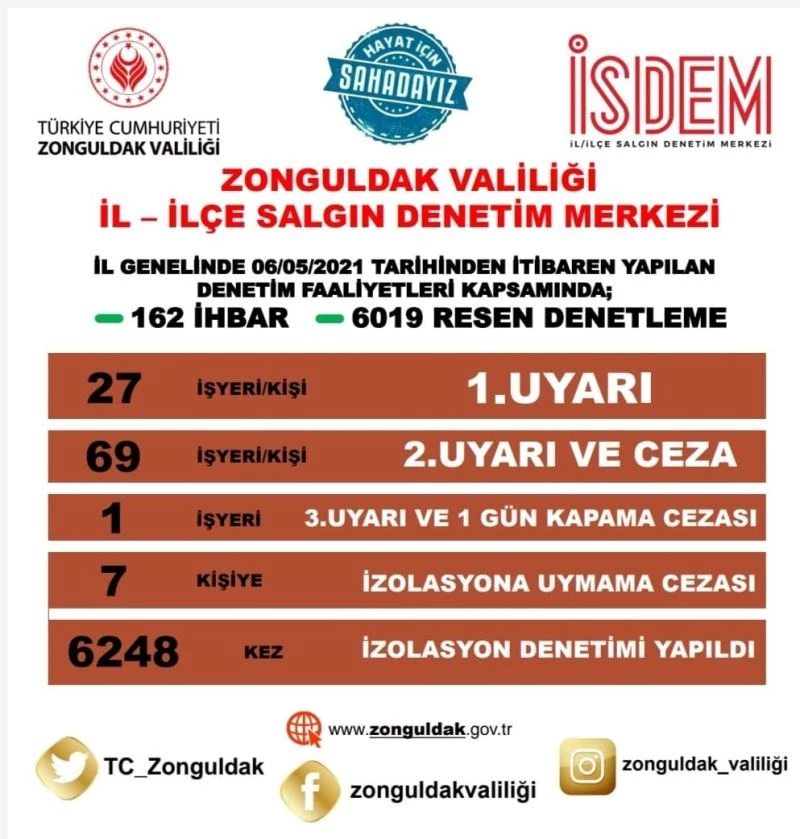 Edinilen bilgiye göre, Zonguldak Valiliği İl-İlçe Salgın Denetim Merkezi haftalık korona virüs denetimlerini aralıksız sürdürüyor. Ekipler, 6 bin 19 resen denetim, 162 ihbar ve 6 bin 248 izolasyon denetimi gerçekleştirildi. Denetimlerde 27 kişiye ilk uyarı 69 kişiye ikinci uyarı ve para cezası 7 kişiye ise izolasyona uymama cezası, 1 iş yerine 3’üncü ve kapama cezası uygulandı.