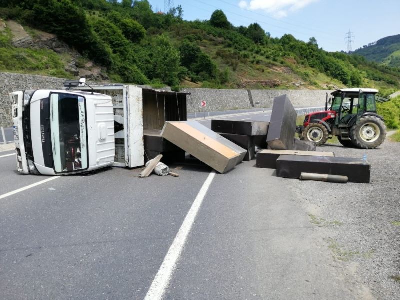 Zonguldak’ta Ereğli ilçesine dolap taşıyan bir kamyonet kontrolden çıkarak devrildi. Kazada araç sürücüsü hafif şekilde yaralandı. Sürücü, kontrol amaçlı hastaneye götürüldü.