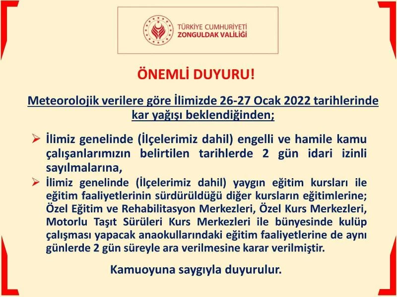 Zonguldak Valiliğinden yapılan açıklamada, meteorolojik verilere göre kentte 26-27 Ocak tarihlerinde kar yağışı beklendiği hatırlatılarak, il genelinde engelli ve hamile kamu çalışanlarının belirtilen tarihlerde iki gün idari izinli sayılmalarına karar verildiği ifade edildi. Yapılan açıklamada ayrıca, "İlimiz genelinde (ilçelerimiz dahil) yaygın eğitim kursları ile eğitim faaliyetlerinin sürdürüldüğü diğer kursların eğitimlerine; Özel Eğitim ve Rehabilitasyon merkezleri, özel kurs merkezleri, motorlu kara taşıt sürücü kurs merkezleri ile bünyesinde kulüp çalışması yapacak anaokullarındaki eğitim faaliyetlerine de aynı günlerde iki gün süreyle ara verilmesine karar verilmiştir"denildi.