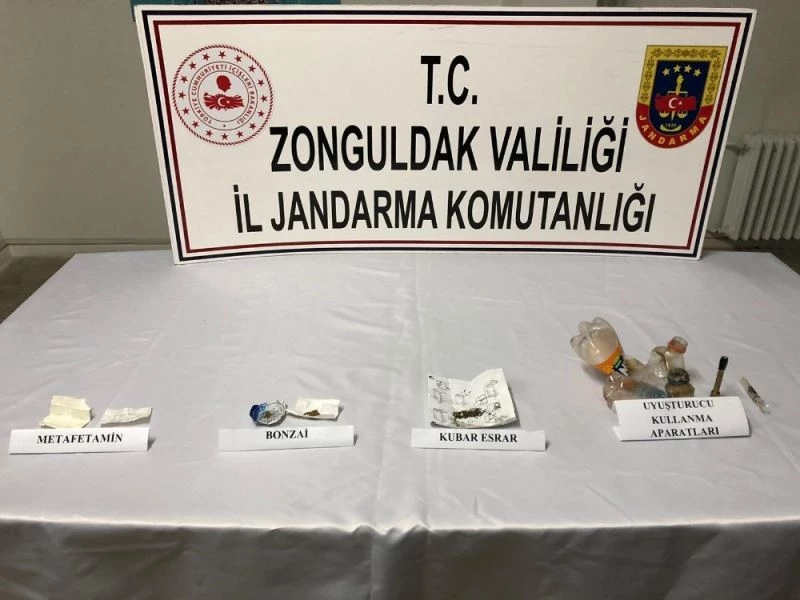 Edinilen bilgiye göre Zonguldak İl Jandarma Komutanlığı İstihbarat Şube Müdürlüğü ve Alaplı İlçe Jandarma Komutanlığınca yürütülen istihbari faaliyetler sonucunda Alaplı ilçesine bağlı Kılçak köyü Fatih Mahallesi’nde bir eve baskın düzenlendi. Evde ikamet eden M.T. (33) ve F.K. (26) isimli şüphelilerin uyuşturucu madde ticareti yaptıkları bilgisi üzerine düzenlenen operasyonda çok sayıda uyuşturucu madde ele geçirildi. Şüphelilerden birinin aracında diğerinin evinde yapılan aramada 2 gram metamfetamin, 4 gram bonzai, 2 gram kubar esrar, 4 adet uyuşturucu madde kullanma aparatı ele geçirildi.