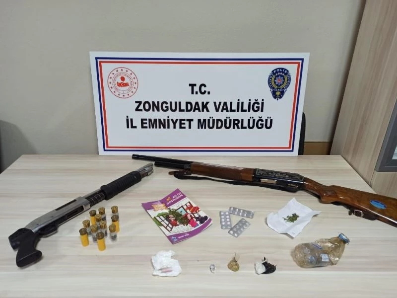 Edinilen bilgiye göre Kdz. Ereğli ilçesinde uyuşturucu ticareti yapan, kullanan ve bulunduran şahıslara yönelik narkotik suçlarla mücadele KOM Grup Amirliğince yapılan operasyonda K.S. isimli şüphelinin ikametinde 4.92 gr metamfetamin, 3 adet extacy hap, 16 adet sentetik ecza, 6.72 gr toz esrar, 5.65 gr esrar, 3.10 gr esrar, 1 adet ruhsatsız pompalı tüfek, 1 adet ruhsatsız av tüfeği, 11 adet fişek ele geçirildi.